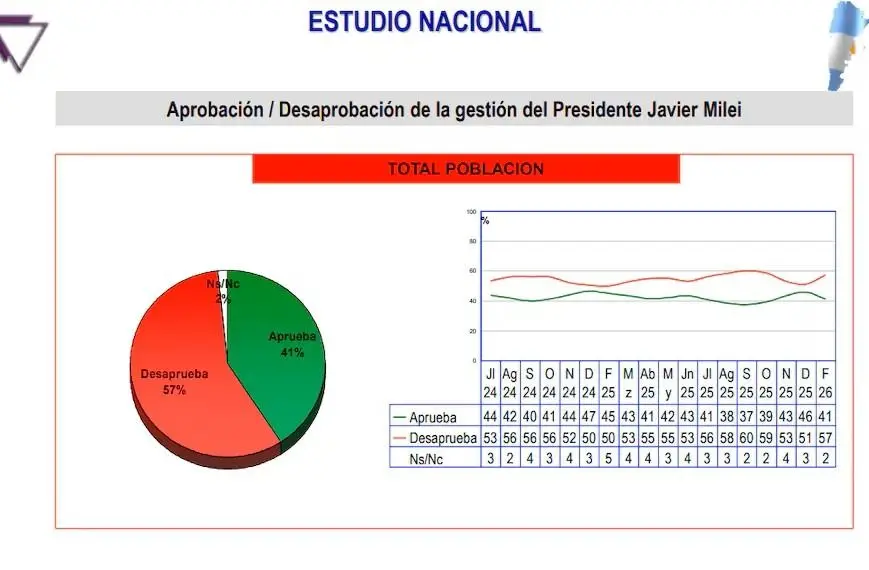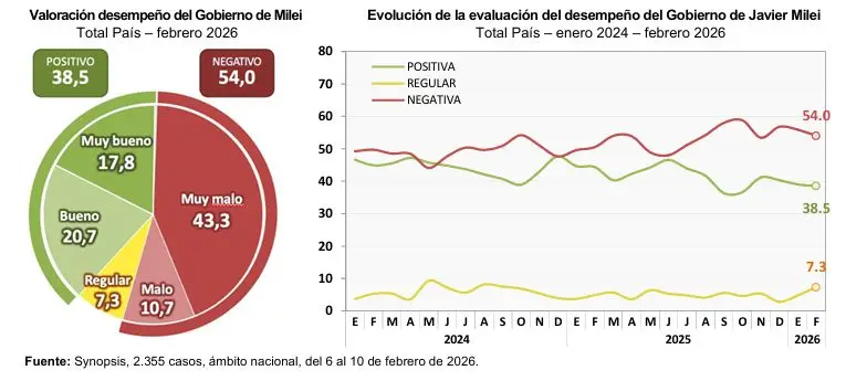 Esta semana se conocieron los últimos trabajos de las consultoras Synopsis y Hugo Haime y Asociados, que coincidieron en registrar una merma en la imagen de Javier Milei. Si bien la caída aún es leve, ratifica la tendencia a la baja iniciada en enero. En el caso de Synopsis, la imagen positiva se ubicó en 38,5% y la negativa en 54%. “La imagen positiva vuelve a estar por segundo mes consecutivo por debajo del 40%, apenas dos puntos por encima de los niveles de septiembre de 2025, el momento más crítico del oficialismo”, señaló la consultora que dirige Lucas Romero. Por su parte, el relevamiento de Hugo Haime y Asociados arrojó un 41% de aprobación frente a un 57% de rechazo. Ambos sondeos coinciden en mostrar un diferencial negativo para el Presidente en torno a los 16 puntos, consolidando un deterioro que, aunque gradual, empieza a adquirir consistencia.