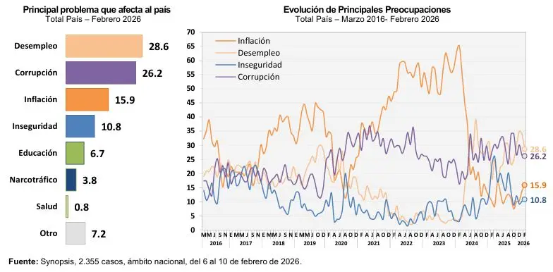 Debido al repunte de los últimos meses, la inflación volvió a ubicarse entre las principales preocupaciones de los argentinos, con el 15,9% de las respuestas. Quedó sólo por detrás del desempleo (28,6%) y la corrupción (26,2%). “La preocupación por la inflación acompaña el rebote inflacionario reciente y se duplicó desde el registro de octubre a hoy”, señaló el informe de Synopsis. Si bien el desempleo mostró una leve baja respecto de la medición anterior, se mantuvo como la principal inquietud en un contexto marcado por el cierre de empresas -a un ritmo estimado de 30 por día- y el deterioro del mercado laboral. Se trata, además, de una preocupación transversal que atraviesa a todo el electorado: incluso entre los votantes de La Libertad Avanza aparece como el problema más acuciante.