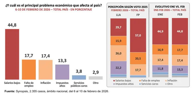 En cuanto a las variables estrictamente económicas, los bajos salarios aparecen como el principal problema, con el 44,8% de las respuestas, muy por encima de la falta de empleo (17,7%) y la inflación (17,4%). “La preocupación por la caída de los ingresos -salarios bajos y falta de empleo- lidera la agenda económica y funciona como un motor de la demanda de cambio entre quienes la señalan”, detalló el informe. Más del 60% de quienes identificaron alguno de estos dos factores como el principal problema adelantaron que buscarán un cambio de rumbo en el país en las próximas elecciones. En contraste, entre quienes ubican a la inflación en el centro de las preocupaciones predominan quienes sostienen su apoyo a la continuidad del Gobierno de Javier Milei.