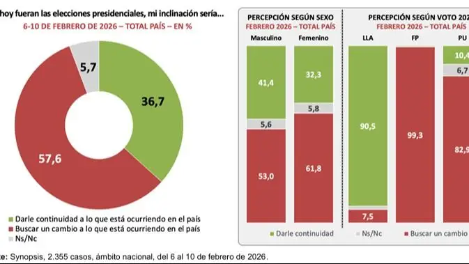 "La competitividad de Javier Milei para 2027 luce más por el espanto que por el encanto", advirtieron desde la consultora. La reelección aparece hoy como la opción más probable, aunque más asociada a la debilidad de las alternativas que a la fortaleza propia del oficialismo. En términos generales, un 57,6% de los encuestados manifestó que buscaría un cambio en el rumbo del país, frente a un 36,7% que se inclinó por la continuidad.