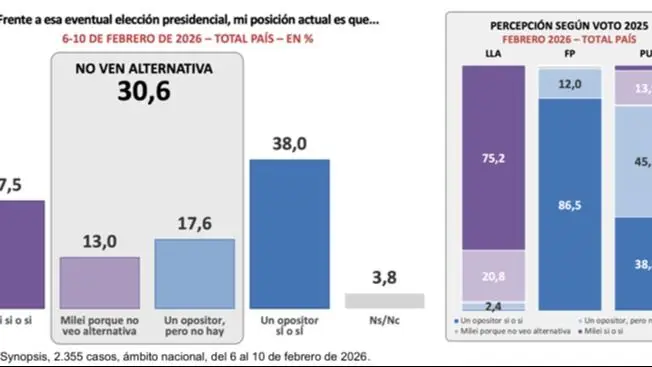 Sin embargo, al desagregar esas preferencias emergen matices relevantes. El voto “Milei sí o sí” se ubica en 27,5%, lo que configura el núcleo duro libertario. A eso se suma un 13% que lo votaría en ausencia de una opción superadora. Del otro lado, entre quienes expresan voluntad de cambio, un 17,6% aseguró que elegiría a un opositor pero “no hay”, una señal de alerta para Unión por la Patria. En tanto, un 38% afirmó que optará por un candidato opositor sin condicionamientos. Las mayores dudas se concentran en el electorado de espacios de centro, como Provincias Unidas, hoy prácticamente desarticulado tras sus malos resultados y la falta de una posición clara frente a las políticas del Gobierno.