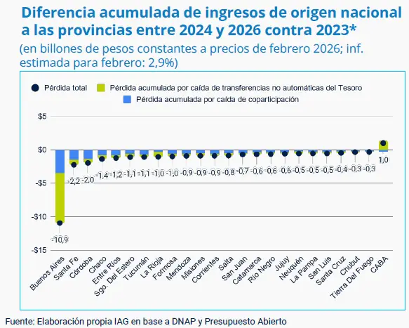 En concreto, a comienzos de este año las provincias ya habían acumulado una pérdida de $15,3 billones (a precios de febrero2026) respecto al nivel de recursos nacionales de 2023. “Producto de la caída de la recaudación de los últimos dos años, cayeron los recursos tributarios de origen nacional (los recursos coparticipados) que reciben las provincias, pero también cayeron las transferencias no automáticas que hace el Gobierno”, señaló un documento del Instituto Argentina Grande (IAG).