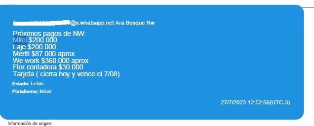 El valor de las transferencias individuales (200.000 pesos) coincide con otro de los mensajes enviados por Novelli en el que se lo ve organizando los diferentes pagos para influencers y trabajadores de su consultora.