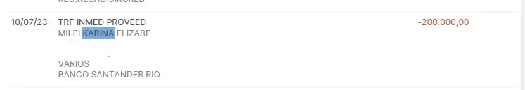 En el celular de Novelli se encontraron al menos dos transferencias en pesos hacia una cuenta bancaria de Karina. La primera realizada el 10 de julio de 2023 y la segunda el 1 de agosto. El total transferido había sido 400.000 pesos. Al tipo de cambio de la época (alrededor de los 287 pesos), eran 1300 dólares.