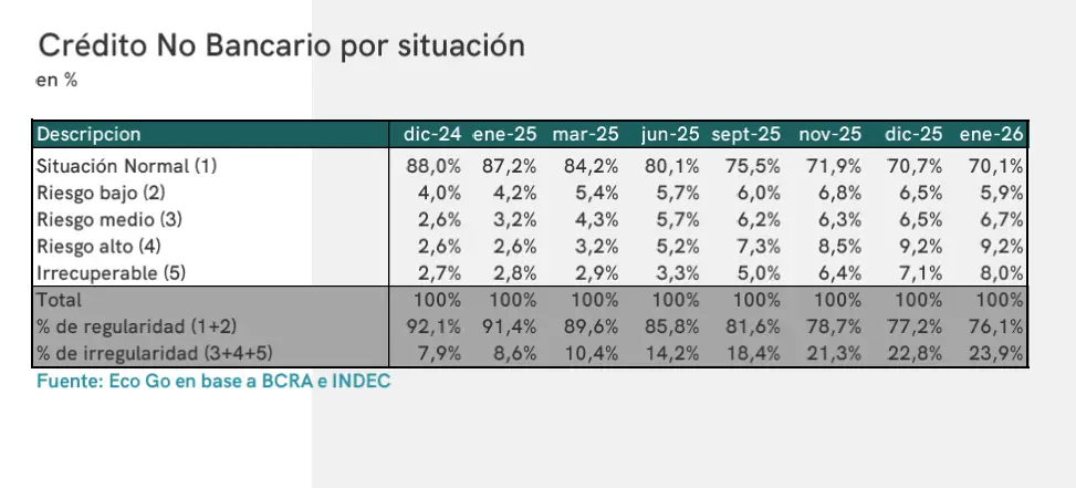 La irregularidad de las carteras de las entidades no bancarias volvió a aumentar y se ubicó en el 23,9%, casi cuatro veces la irregularidad del crédito total del sistema financiero y 2,4 veces la del crédito para consumo bancario de las familias.