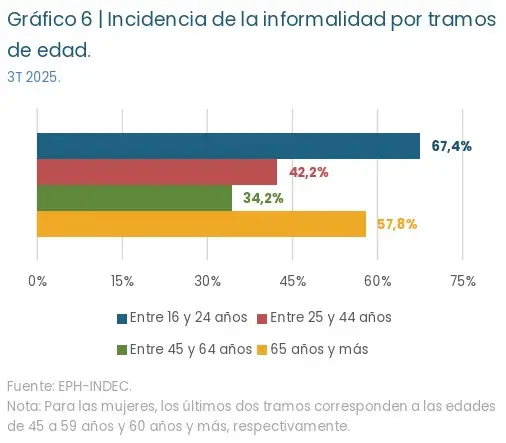 En el cuarto trimestre del 2025, la tasa de informalidad fue del 43%, lo que supone que 4 de cada 10 trabajadores se encuentran en empleos que no están cubiertos por la legislación relevante, sea laboral, impositiva y de la seguridad social. Sin embargo, al profundizar sobre el universo laboral paralelo al registrado, las cifras son aún peores para un segmento social emparentado con La Libertad Avanza en las últimas elecciones presidenciales: siete de cada 10 trabajadores jóvenes son informales.