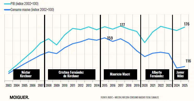 Por su lado, entre 2020-2023 (mandato de Alberto Fernández) se destacó la caída significativa del primer año, con la crisis de la pandemia por COVID-19 y con una recuperación posterior parcial. Ya en la gestión de Javier Milei (2024–actualidad) se produjo una nueva caída fuerte del consumo, con un PIB que rebotó en el segundo año de mandato pero con un consumo que no recuperó los niveles previos a la asunción del actual Gobierno y se ubica hoy más próximo a los registros del 2002.