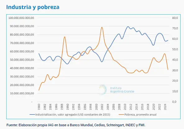 Considerando tal estado de situación, un centro de estudios analizó el vínculo entre la situación de la industria y sus fuentes de trabajo, con la evolución de la pobreza y concluyó que “sin recuperación industrial sostenida, no hay reducción duradera de la pobreza”. De acuerdo con los datos, se observó que “la pobreza en términos estructurales ha tenido un recorrido relacionado con el al empleo industrial” al punto de que “el único momento en el que coincide una baja de la pobreza con una caída de la industria es a la salida de la hiperinflación”, según consignó un estudio del Instituto Argentino Grande (IAG).