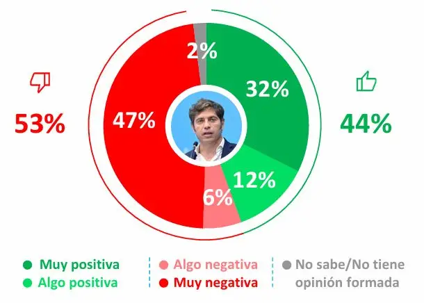 Esa caída hace que, aun sin grandes variaciones en sus propios porcentajes, Axel Kicillof -quien se perfila como principal referencia de la oposición- quede nueve puntos por encima de Javier Milei, con 44% de imagen positiva y 53% de negativa. Vale destacar que la imagen no siempre se traduce en intención de voto: con niveles similares de respuestas positivas aparece la legisladora del FIT Myriam Bregman, que viene mostrando buenos números en varios sondeos y canaliza parte del enojo y la frustración de un sector de la sociedad. La ex presidenta Cristina Kirchner se ubica en un nivel similar al de la jefa del bloque de senadores de La Libertad Avanza, Patricia Bullrich, cifras que hasta hace pocos meses resultaban impensables.