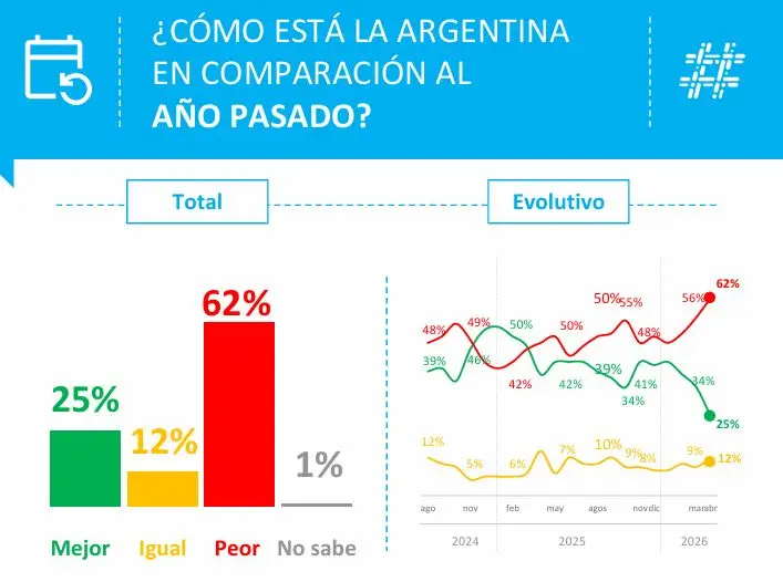 Aunque los escándalos del caso $LIBRA y el que involucra al jefe de Gabinete, Manuel Adorni, afectan el humor social, manda la situación económica. Un 62% opinó que la Argentina está peor que el año pasado, 14 puntos más que en diciembre, y apenas un 25% sostuvo que está mejor. Pero, a los efectos de las expectativas y de la evaluación de la gestión actual, resulta más relevante la mirada sobre el futuro. Allí también se verifica una caída pronunciada: las opiniones positivas bajaron ocho puntos en un mes y sólo un 29% cree que el año que viene la situación estará mejor, mientras que un abrumador 57% sostiene que será peor.