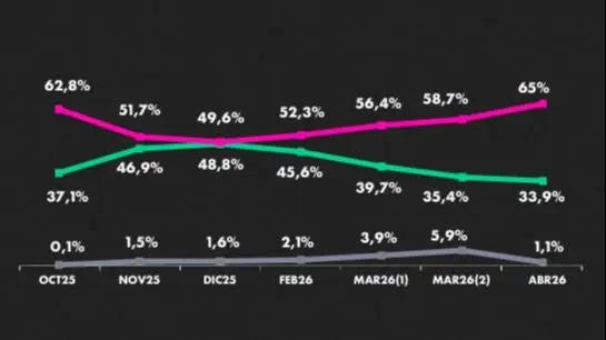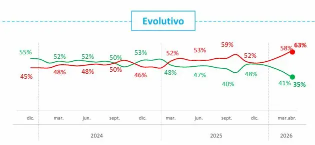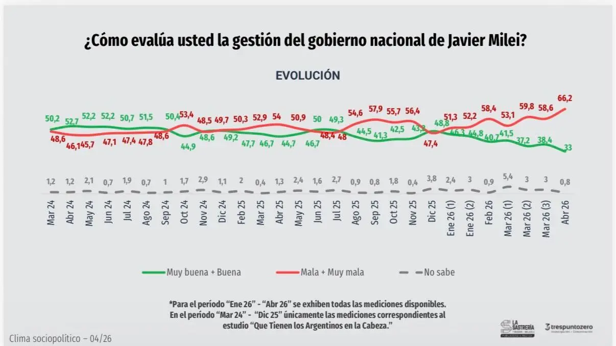Este miércoles se conocieron otros dos sondeos de consultoras reconocidas, con resultados coincidentes que confirman la fuerte caída del oficialismo. En el caso de Zubán Córdoba y Asociados, la aprobación cayó 15 puntos desde diciembre y se ubicó en abril en 33,9%, con un rechazo que alcanzó el 65%. Según Trespuntozero, la pendiente desde fin de 2025 es casi idéntica: la aprobación se redujo al 33% an abril y el rechazo trepó a un récord del 66,2%. Una encuestadora puede equivocarse; varias, con datos tan coincidentes, difícilmente.Fuente:
