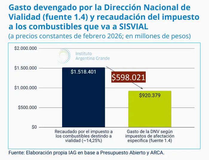 Los economistas explicaron que el gasto que hace Vialidad a cuenta de la fuente de ingresos de fideicomisos (fuente 1.4 según el Informe del Jefe de Gabinete N° 140) no acompañó lo recaudado por el impuesto a los combustibles que debe dedicarse al mantenimiento del sistema vial nacional. Mientras que el 14,25% de lo recaudado por el impuesto desde el cambio de gestión totaliza un $1.518.401 millones (a precios de febrero 2026), la DNV gastó $920.578 millones, un 39,8% menos. “Esta diferencia ($598.021 millones) abulta el superávit del que el gobierno se jacta, pero hace que el estado de las rutas empeore cada vez más”, aseguraron.