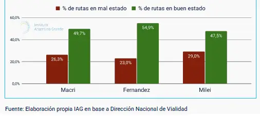 Un punto central lo constituye el gasto total de la Dirección Nacional de Vialidad que en 2025 cayó 72,3% contra 2023 en términos reales y fue el más bajo desde 2002. Si se compara con la situación previa al inicio de la gestión libertaria, mientras en ese entonces el 23% de las rutas nacionales estaba en mal estado, ahora ese guarismo escaló al 29% (+6 puntos porcentuales) como resultado de la política de desinversión en marcha.